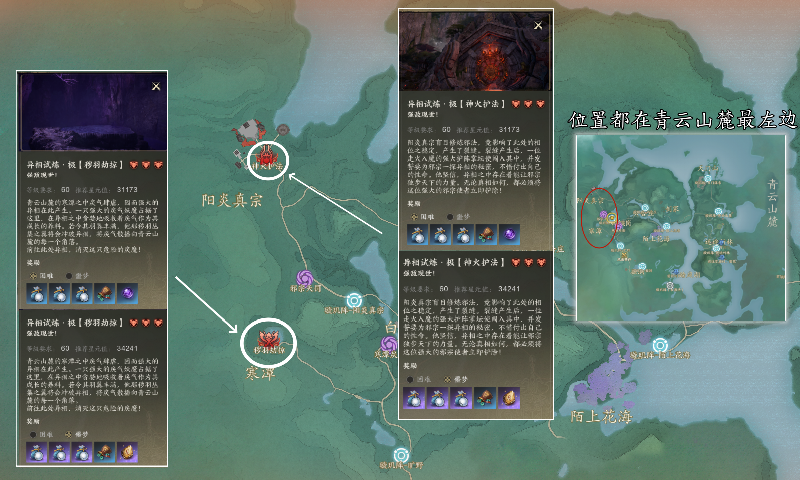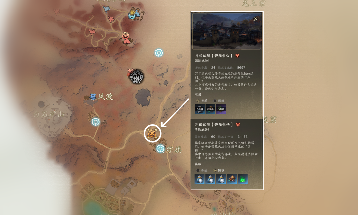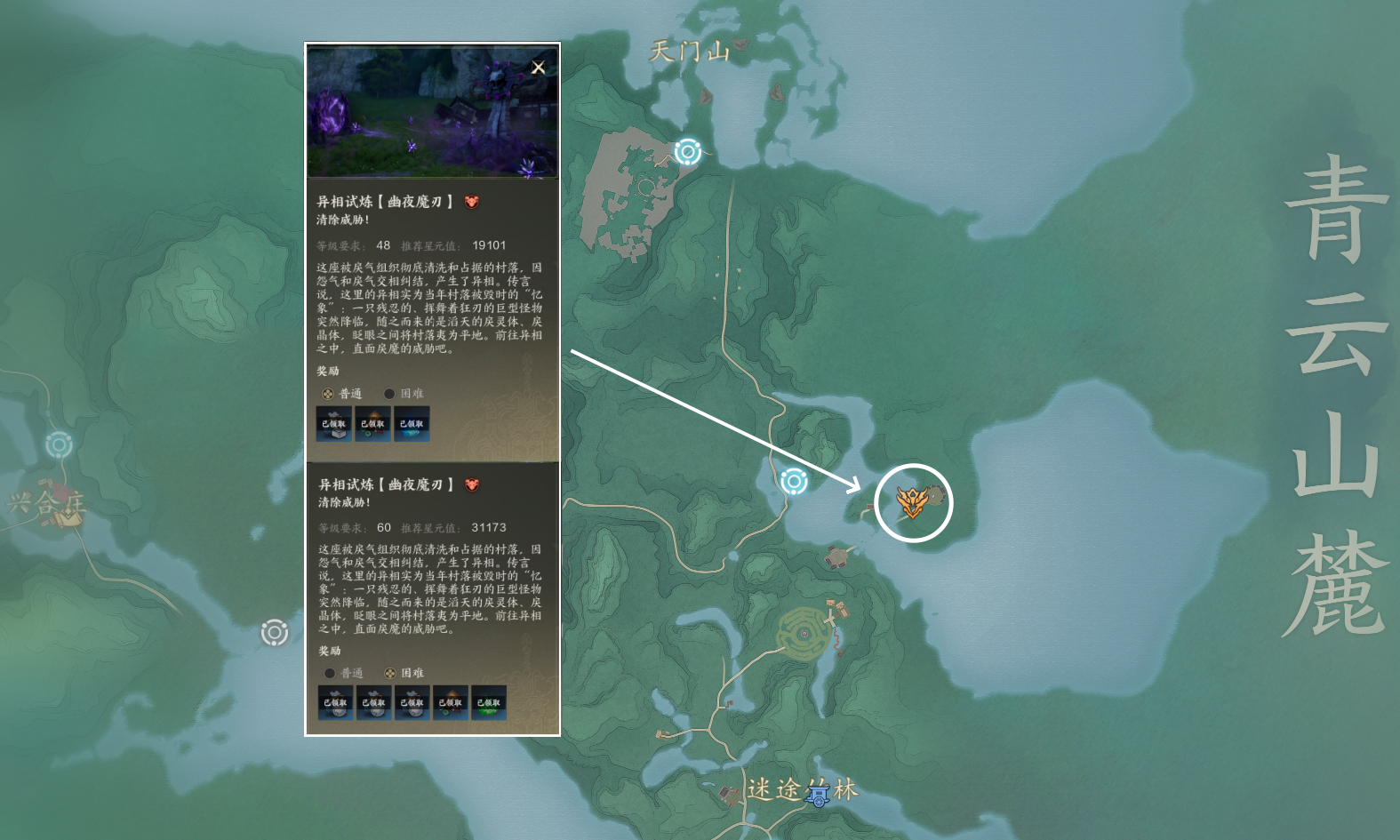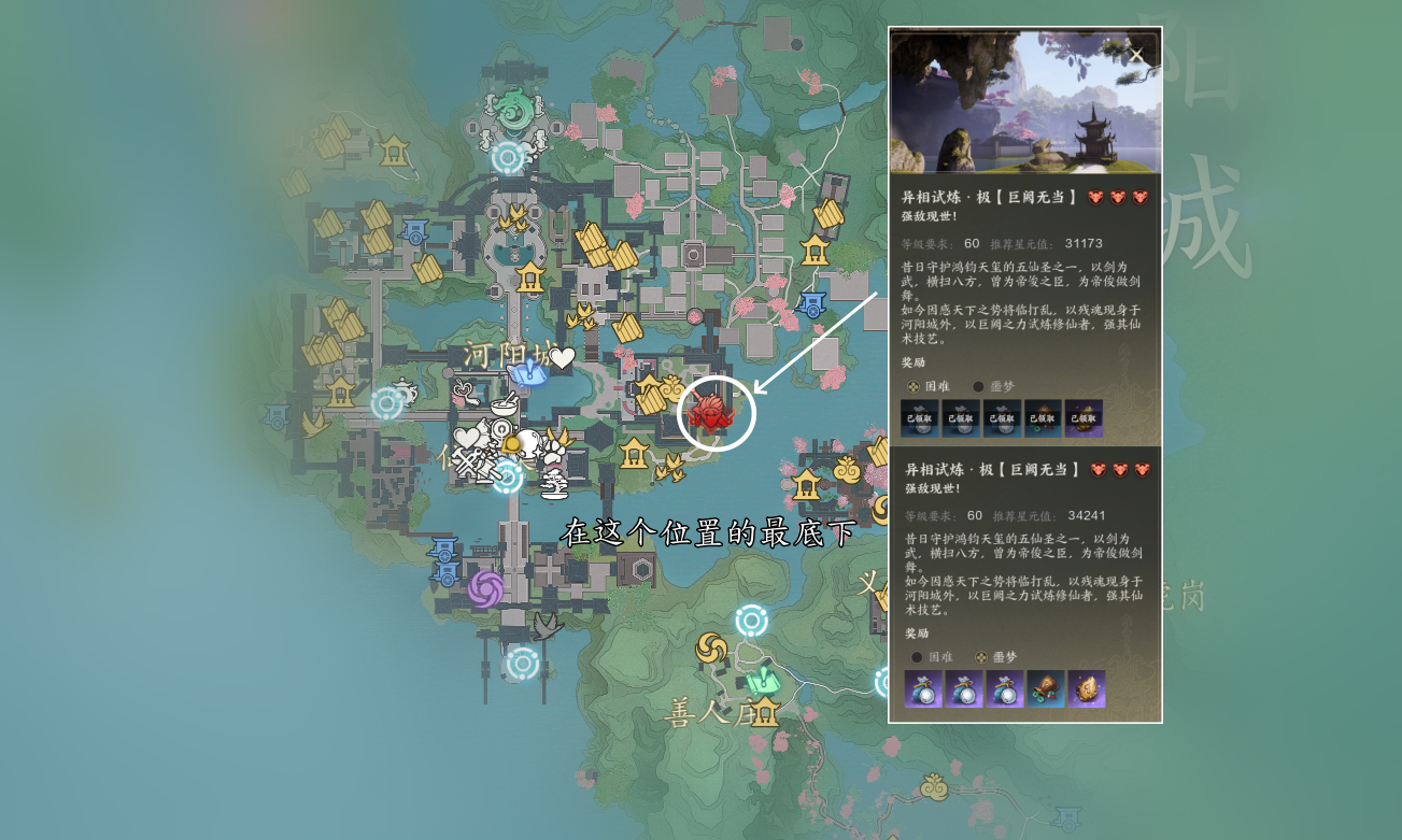 异相试炼玩法是角色一次性收益,按照等级挑战,进入副本后只有一个BOSS,不可以组队,通关奖励非常好,还有大量银两。60级之前如果我们挑战对应等级的普通异相副本吃力的话,可以等升级稍高一些再去挑战,60级以后的困难以及噩梦异相副本,就需要些手法操作了。这次主要是分享位置,如果大家需要的话,也可以给大家出一期所有异相副本的通关攻略。
